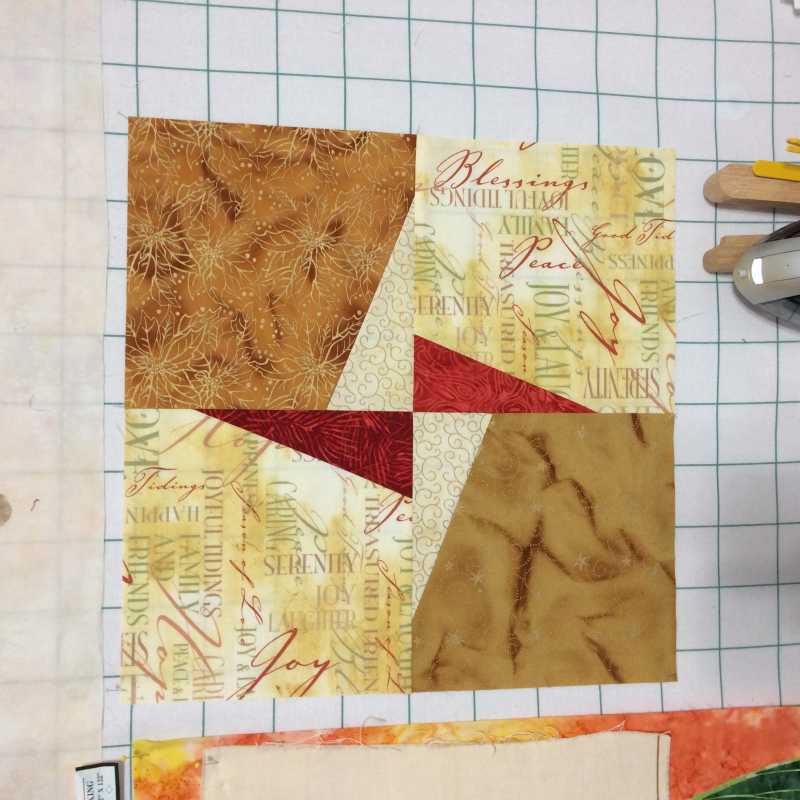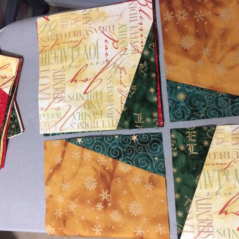 I watched Gudrun from GEDesign Studios do a Stella Quilt. I knew that I wanted to use a layer cake of Christmas fabric so within less than 1 hour I had everything cut for the blocks for my Stella. All blocks have the 4 units made, and they sew together quickly.