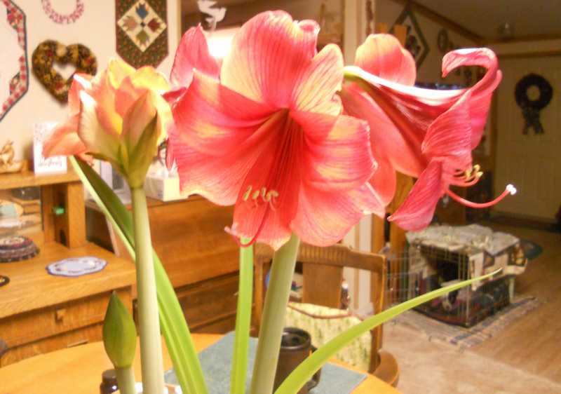 I got a couple of amaryllis bulbs this yr, one red and one bi-color and put them in the pot together. The red one had 4 blooms .