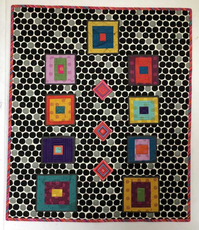 In other news... my thumb is better, but still not as good as I'd like, (pain free!). I've learned to sew with the brace on, which allowed me to finish one little quilt I made. This was a completely unplanned quilt, made from scraps from the Galaxy quilt that I am still trying to complete. "Balancing Act."