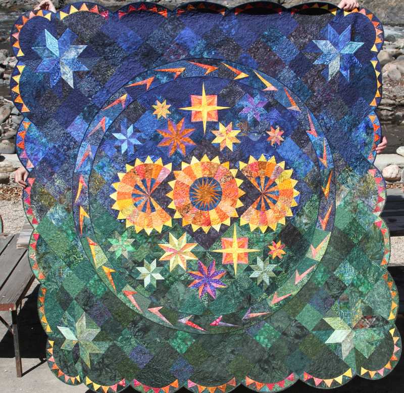 I do have a top on the design wall for about 6 months and have been designing the quilting. I believe I have the quilting narrowed down, but... I purchased the pattern in 2012 and quickly made the quilt. I love this quilt. I have noticed at shows there isn't another one, so I made a new quilt and want to add some bling and do creative quilting and enter it into shows. It is called Summer Sunset.