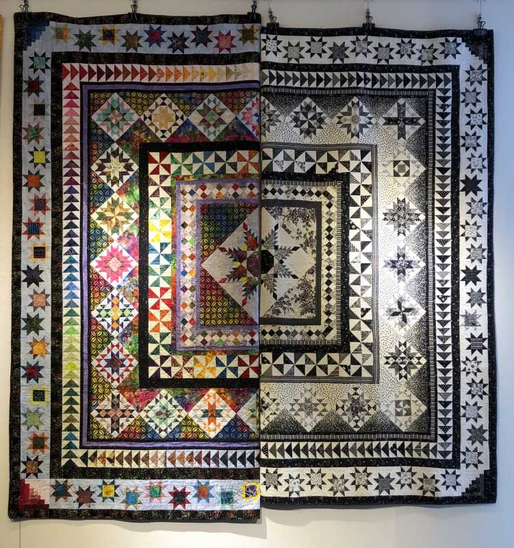 Our local guild was asked to hang quilts at a local Art Gallery "Allied Arts" in Richland, WA for the month of January. My friend Cheryl Garrison and I have been wanting to hang our Sue Garman 2009 Stars for a New Day quilts together. (Mine is called "June Cleaver on Acid.") Today we hung them together! The amazing thing is that these were made in 2009 when I lived in California and Cheryl lived in Michigan. We did not know each other until we both moved here and met at the guild a few years ago. We had been talking about our quilts and realized that hers was a study in black and white and mine was a riot of every color possible. We are so pleased to see them hanging together. It's interesting that by using Sue's pattern and instructions one quilt came out a little larger than the other. But that's why Sue taught us to measure and cut our borders to match our sizes. Sue was a wonderful teacher. She is missed.