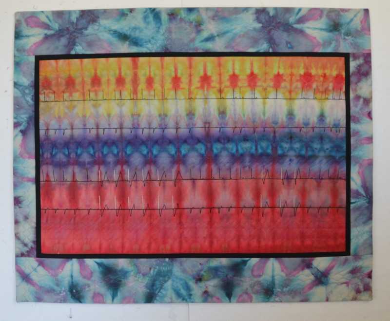 I don't see the quilt I made that released a lot of emotion about my husband's pacemaker surgery. (He's doing well). It's called "Heartbeat: Making Pace". If I've showed it before, I'm sorry. The fabric is a piece that I hand dyed a year or so ago. The top lines show the pauses in his heartbeat. The lower lines show the healthy heartbeat with fresh oxygen and blood flowing.