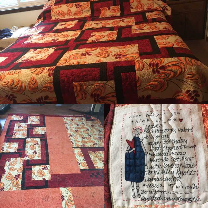 I did finish "Leaves" for my daughter in the UK earlier this month. I hope travel restrictions are lifted so that she can come to Oregon for a visit in August and take her quilt back with her. I bought the leaf print fabric more than 11 years ago. It is a Valori Wells print. I liked it so well that I actually went back to the store and bought the remaining fabric. I also bought the other fabrics. I had no plan and didn't come up with one until last October. I sent Valori an e-mail about the finish and received a complimentary e-mail in return. In her last line she said my e-mail had made her day!