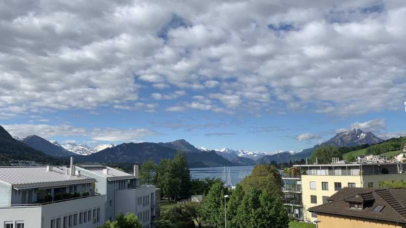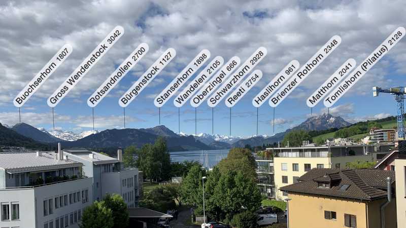 and this was my view out the window one morning last week (may 4th) - we rarely get such a clear sky where we can see so far into the alps - i've made two pictures - the second with the peak-finder app - which shows the names of the mountain peaks.