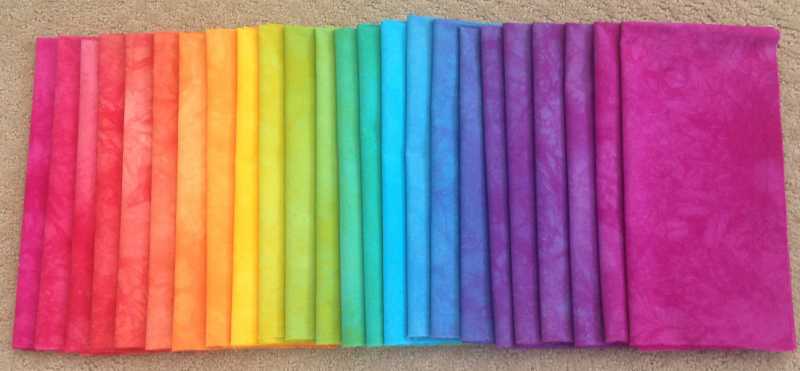 First I'll show "Direction". "Direction" is made with the last bit of 24 hand dyed fabrics I made in August 2016. I figured out that if I use up all the hand dyes I get to dye more! Yippee! Here is a picture of those 24 fat quarters.