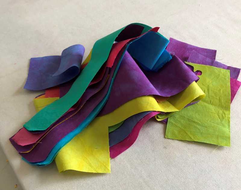 I had the 5"x7" notecard enlarged to 20"x28". I then placed freezer paper over it and traced the design. I had iced dyed some fabric last summer and wanted to use it for this project. I pressed the freezer paper over the particular piece of fabric I wanted the fence made from. Here's what's left of that fabric.