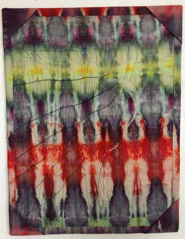 I had a lovely red piece of ice dyed fabric I used for the sunset. I carefully "built" the fence and added it to the top sunset portion. I quilted along some of the pattern of the background to represent the snow drifts. Here is "Technicolor Snow Fence at Sunset".