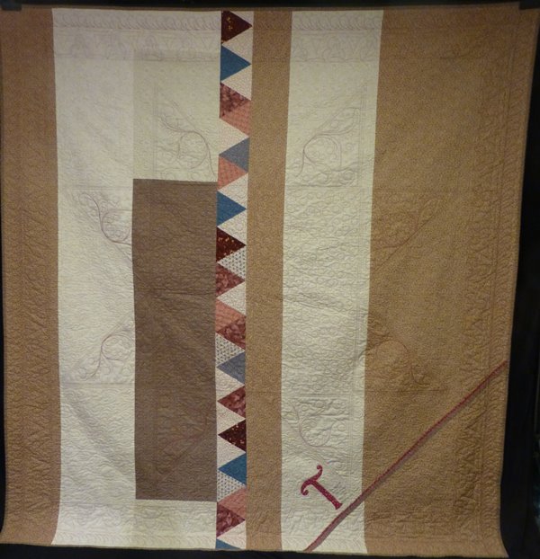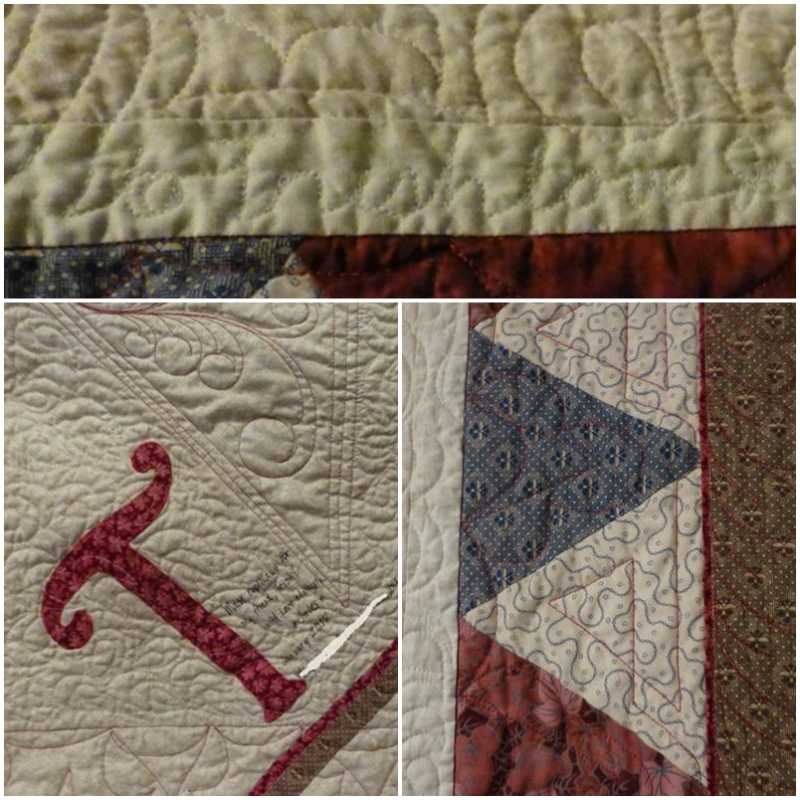 I had just randomly/slightly planned the backing piecing. Just put on the initial and wrote the label where it fit at the bottom. When the quilting was finished and I turned over the quilt, all the label was perfectly in an area with light thread quilting, not the detail quilting I had done in burgundy! I felt a large miracle ta-da moment! #needcurtseyemoticon :P