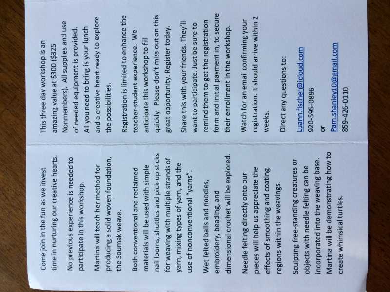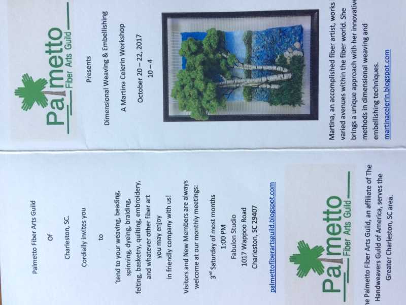 I've been asked to address the loss of our Row Robin thread. I'm as frustrated as the rest of you. I have no idea why it happened, or how to fix it. So,,, I am officially asking everyone to use our virtual retreat thread to post about the Row Robin exchange. It would be really nice if all involved could get their rows and/or fabrics received together and take a photo or two, please. Thanks for continuing on with all of this, as I have become the 'on the shore but cheering' person. I'm glad a got some fabric off to everyone at the onset, as my life turned into a bit of a whirlwind of events and undertakings. One of which has been becoming a Second VicePresident, in charge of programs for the Palmetto Fiber Arts Guild. Little did I know that nothing had been planned for 2016, and programs not only meant presentations at monthly meetings, but workshops, classes, etc etc!! There were no informational forms to follow, or anything written to go by, oh, and did I mention, no designated budget?? I guess I did ok, I was unanimously elected again! But the, no one else was willing to take it over. So, the first few months of this year have been going a lot better, as I believe in planning a year in advance for this type of thing! I stepped out on a limb recently, wrote up a contract, and booked a teacher to come in for a 3-day workshop for this coming October! I need 12 to break even, and I have 7 registered in less than a month! Now it's on to advertising it to our community.