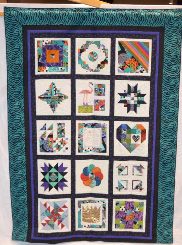 This is a quilt that my friends from Carmel Indiana made the blocks for me and I hand quilted it. It is 100" long. The bottom is pinned up. The pink flamingo block is made by my friend Brenda Papadakis.