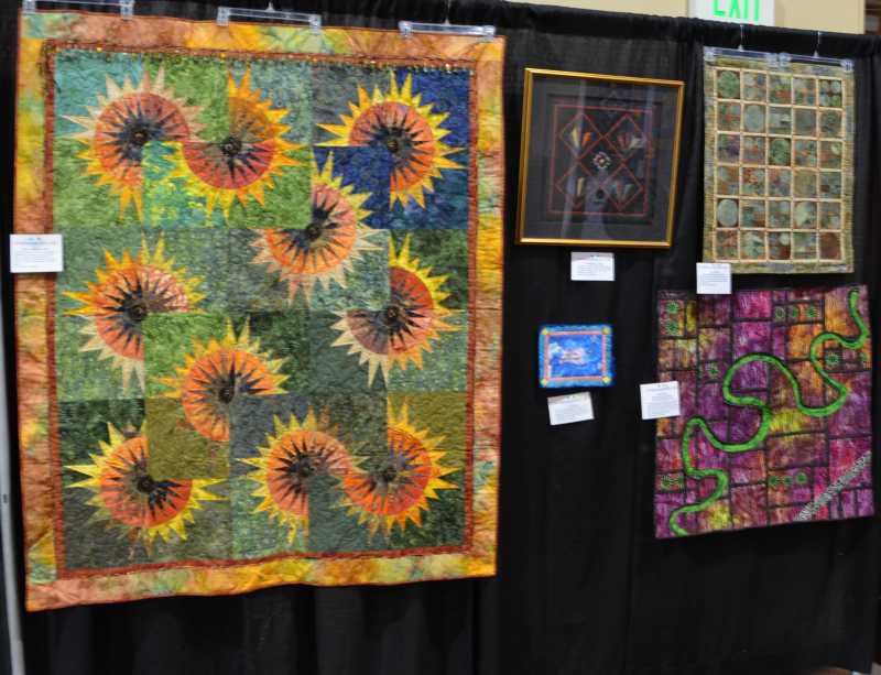 This is the back wall. My daughter's sunflower quilt I made for her graduation, my crop circles quilts and a little quilt my granddaughter and I made together.