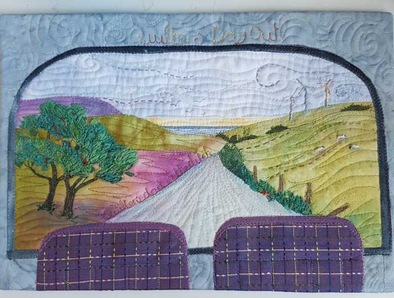 I sprinkled snippets of fabric and scrim onto a piece of the Mistyfuse and ironed it using applique sheet above and below. Then I could tear off pieces that I used in the tree and roadside.