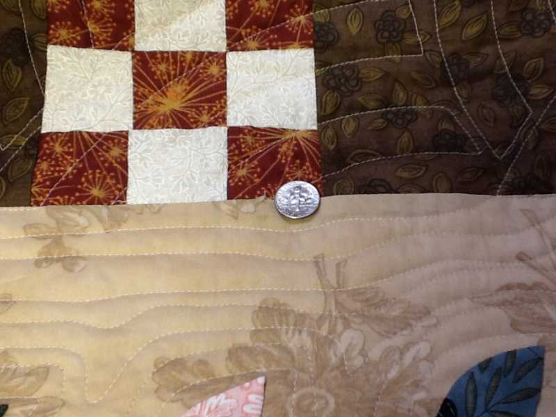 I am in need of the collective wisdom of the forum! My guild just finished our 2015 raffle quilt, and the member who sewed the binding on found a 3-4 mm v-shaped tear in the border near the seam to the quilt center. The usual "sew a berry over it" solution will not work here. Does anyone have a strategy for a secure but nearly invisible repair for a defect like this? The tear is to the left of the dime in the photo.