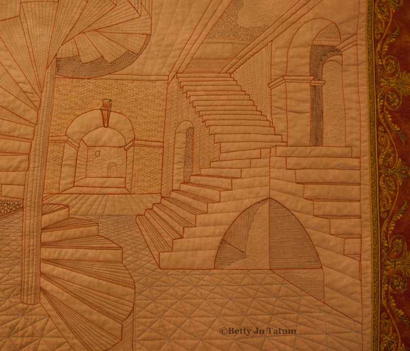 Kathy, You can do a huge amount with straight stitching and rows of decorative stitching. I used free motion on some of this, but not much. Even the shadow under the stairs are rows and rows of straight stitching. I used four different thread weights. This quilt is currently touring with 2014's Tactical Architecture that began in Houston. I suggest using either a dual feed, if you have it, or a walking foot on straight stitch quilting. But such stitching really must have good, solid marking. I really have found that nothing beats Crayola Washables, but, as I said, you DO have to wash or soak it off.