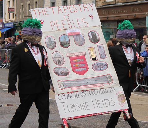 do you want to know the story behind it? - Local parade, topic local. which is - Council passed the propose to spend 3million I think to make a building to hold the famous new Scottish Tapestry - to be repaid over I dont know 70 years maybe. The councillor proposing is said to quote * if other councillors did not agree they had "tumshie heids" scottish for Turnip heads!