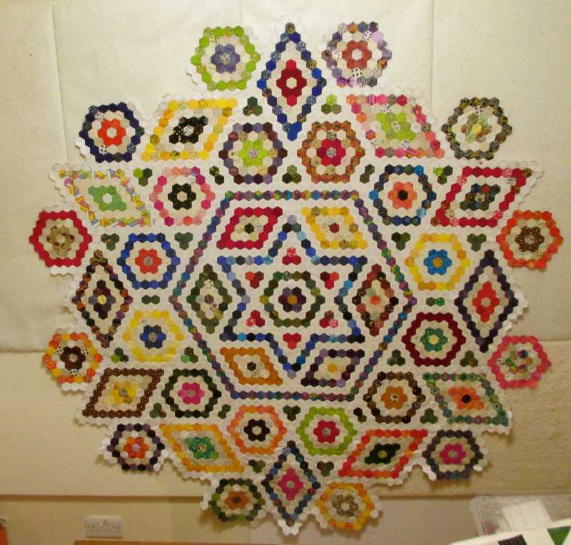 Here is mine so far. Not nearly as complex as yours. My hexagons are slightly less than 3/4". I print out sheets of hexagons and cut them to size but didn't realise that my Mac was printing them out smaller than 3/4" until I was about 1/3 of the way along, :lol: We don't have any of the ready-made ones here and it's too expensive to import 6000+ by post.