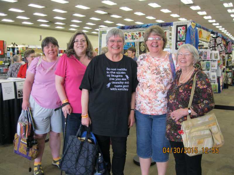 Hi everyone, As many of you know of the TQS site, Hannelore (Lorchen) and 3 friends are in Colorado for a Ricky Tims Retreat and will be touring Colorado after that. They arrived earlier this week and it was planned to meet at the Denver National Quilt Show when Nancy Rehak, Linda (polishquilter)and myself were at the show. After many hugs we had a lovely visit at the cafeteria and giggled like schoolgirls. The lady on the right is Lorchen's friend Brenda and her husband, Brian, took the picture. They are now, as we speak, riding up to the top of Pikes Peak on the Cog Railway and down to LaVeta tomorrow for a week of fun. We hope to connect again when they are getting ready to leave Colorado in 3 weeks. It was a wonderful visit with goodies for Nancy and I from England, including Chocolate!!!
