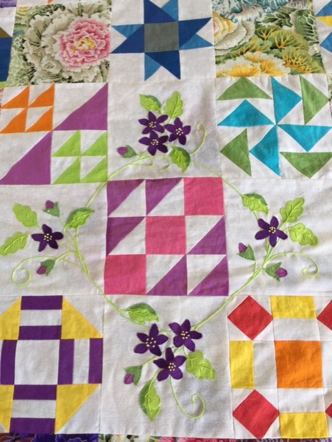 It took me a few days to do the embroidery and applique, but it's done now. Not sure I'm loving the bottom part of the quilt, but I do love the rest of it. Maybe I quit a little too soon? Well, it is what it is, and I did learn a lot... My first ever mitered corners on the borders. A Kaffe stripe I found on line. Now to get it quilted and bound.