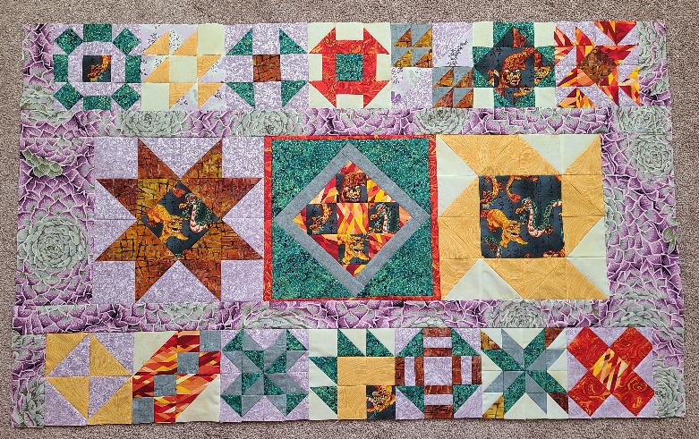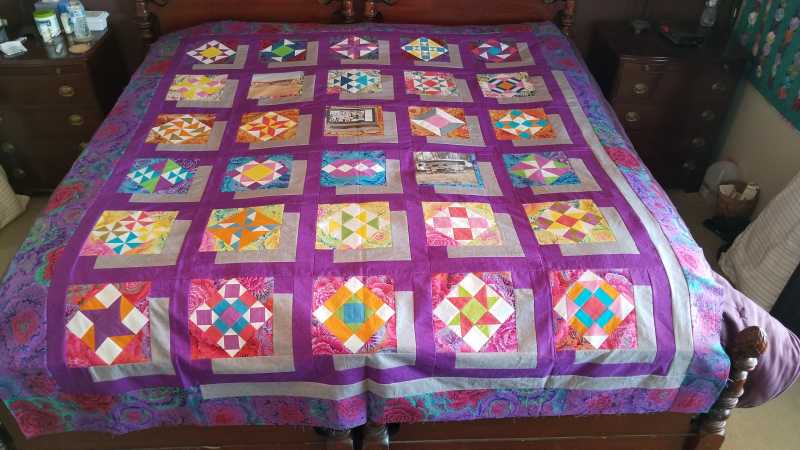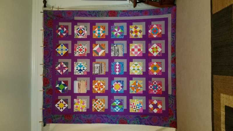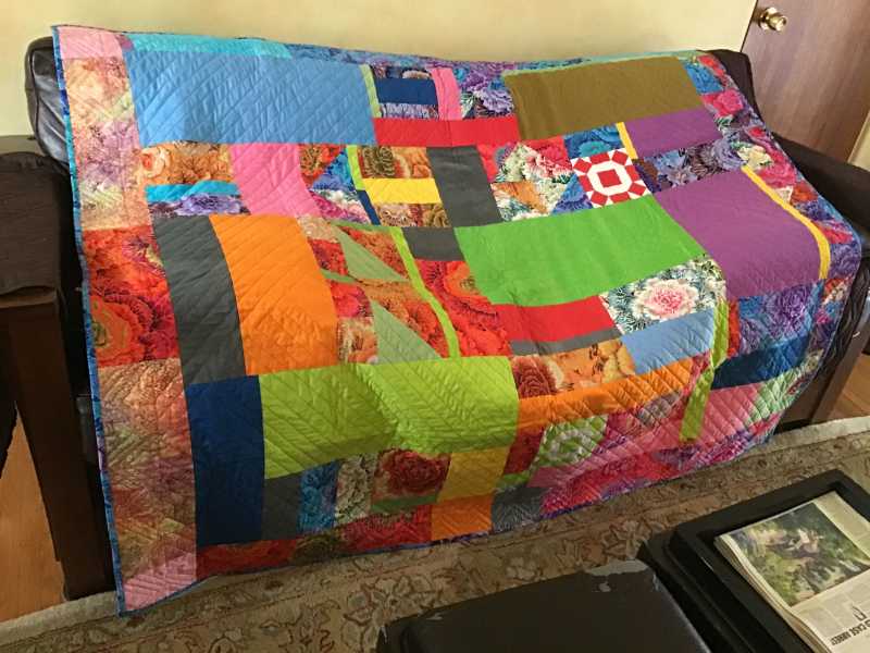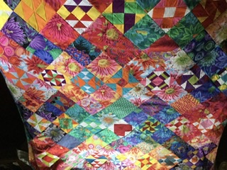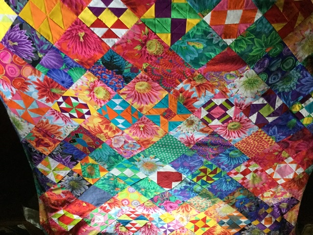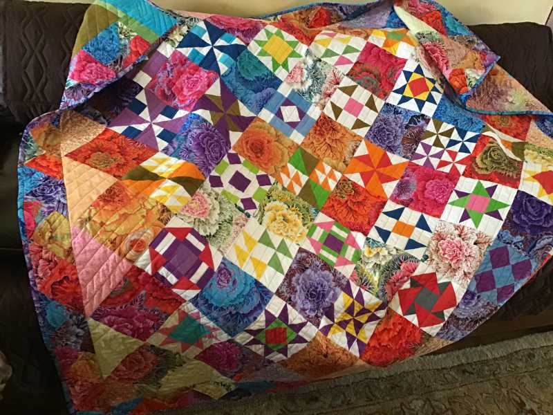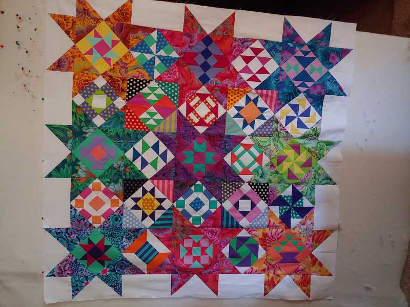 Finally got my Kaffe mystery as a quilt top. Had fun picking out the blocks that I wanted to make and also using the color wheel to select the fabrics. It was fun selecting the colors and then deciding where the colors would go. I would often go to the computer to design the block and place the colors. Many times changing the positions of the colors to a more pleasing place. Thank you Alex for a wonderful experience and learning. As a retired educator, it is always fun learning!!