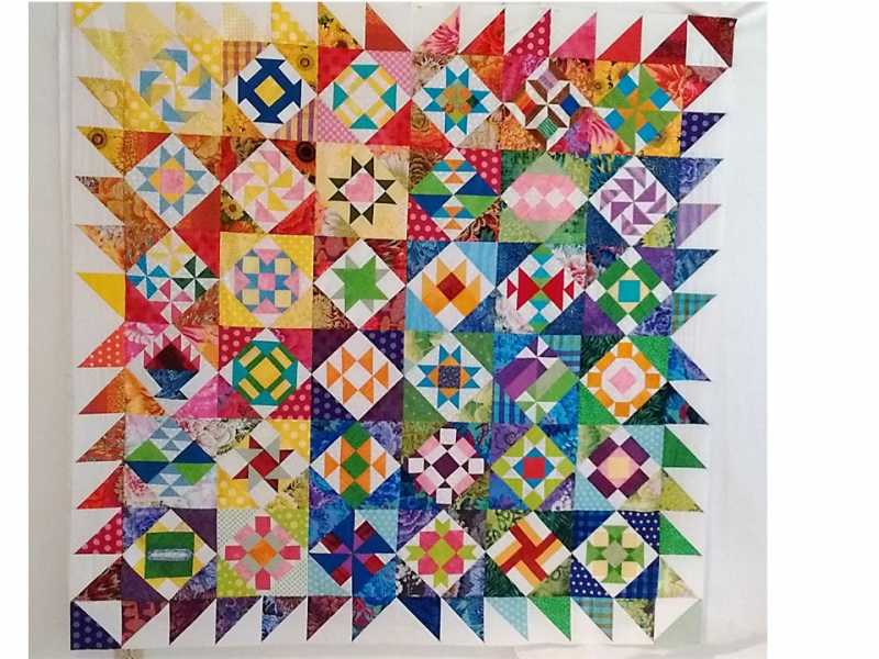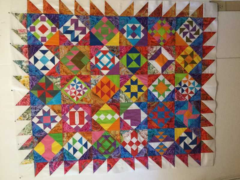 I hesitate to post my finished project as it is not as sophicated or techically perfect as many who have posted. However, my goal was to challenge myself: (!) working with color; (2) trying to imcorporate Alex's lessons to improve my blocks; (3) making more difficult blocks. I had a small amoun of Kaffe farbric from another project. that I used as my inspiration. I did not have many solid fabrics so I used those fabric colors to purchase the fabric from pictures on the Bay Quilts website. That was a real challenge! While this quilt would never win an award I have learned so much from the process. My quilt is simple but also pleasing in its simplicity--at least it is to me. I agree the Block Tool Book is fantastic. I also got a color wheel, which I needed anyway, and found it invaluable for this project. . So for those of you quilters out there who may be new to quilting, I hope my simple little quilt will give you confidence to step out and try something new. Thanks Alex for giving me the confience to make that step!