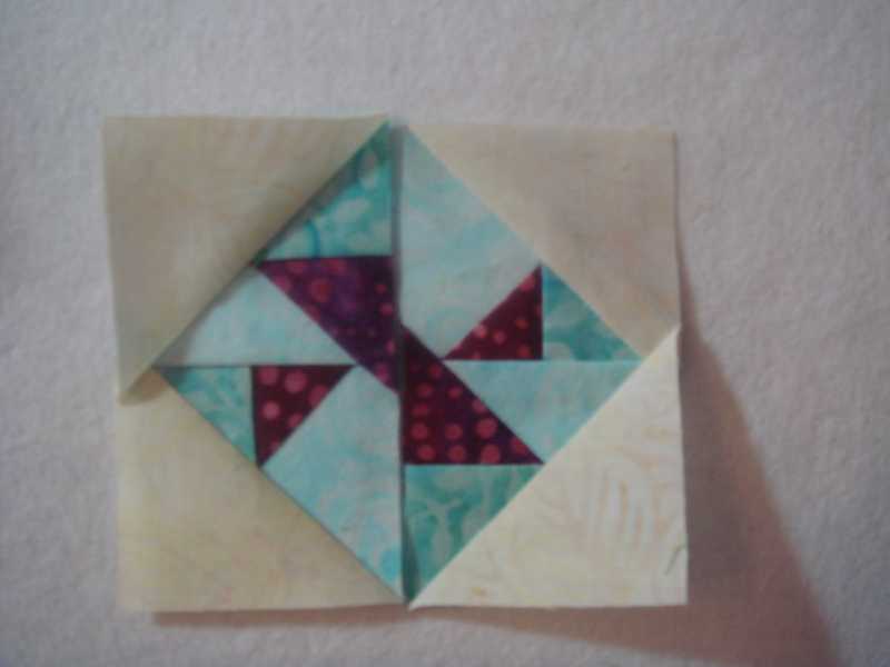 Step 1: Make the squares-in-a-square unit. This photo shows how “oversized” the unit is, which will be trimmed to 2-1/2” x 2-1/2”.