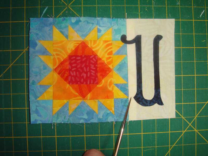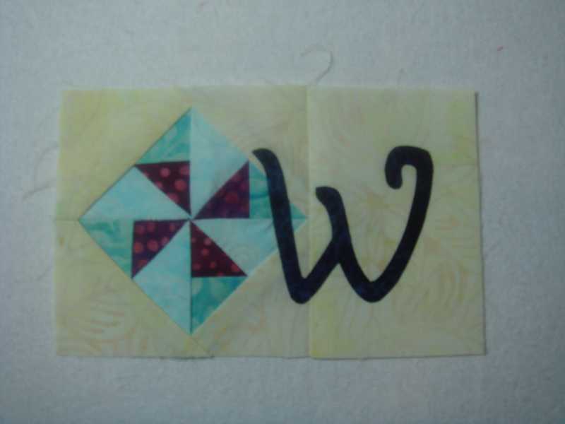 Sew the 2 units together, the block measures 3-1/2” x 3-1/2”. Sew the background rectangle to the right of the block. Fuse the “W” in place, with margins of 3/4” at the top and bottom.