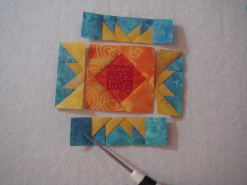 For the “rays” border (it looks like a sun) that I paper-pieced as well, I also cut everything bigger, and I trimmed to the correct size once every unit was completed
