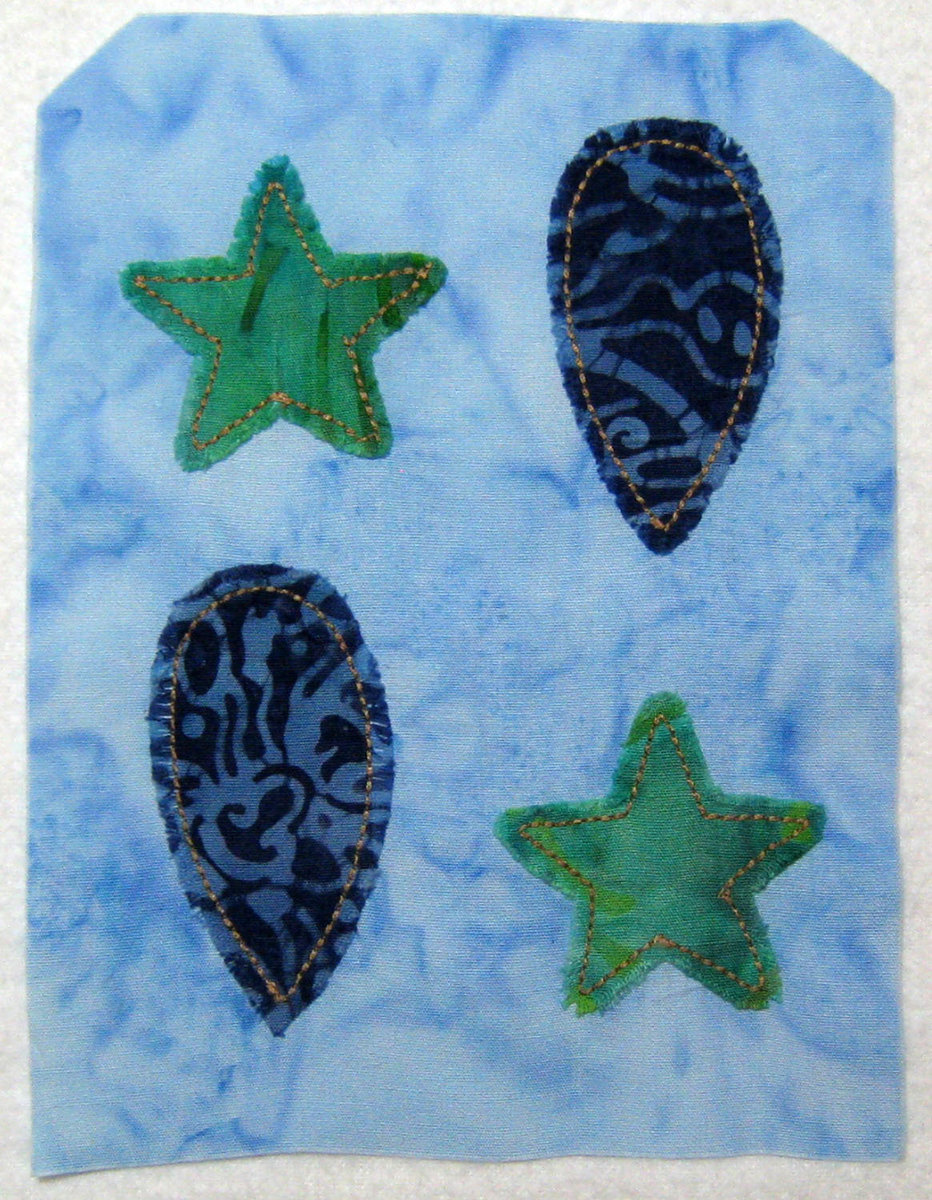 I decided to do a practice block of the frayed edges before proceeding with this quilt. After soaking it with water and agitating it with a toothbrush, it still took lots of work with my finger nails to get it to fray and scissors to clean up the edges. The top ones were clipped before washing. I think I like them better. The edges of the appliqués will be really soft once they are frayed. I may put this project on hold for awhile as I really want to make the Spider Web quilt that Gyleen Fitzgerald has in progress. It looks like lots of easy strip-piecing and I have an idea to use my sew-on-the-line paper technique for sewing the units together without cutting them first. So many projects, so little time... The resizing to 125% is working well for me so far. I have the instructions changed for this month and will continue to do that each month so when I do decide to work on the quilt I will be ready. Also that thread shrinks when it gets wet. It took lots of ironing to stretch it back while it was still wet. I will probably use a stabilizer under the rest of the appliqués, especially since I'm using a glue stick instead of fusible to hold them in place.