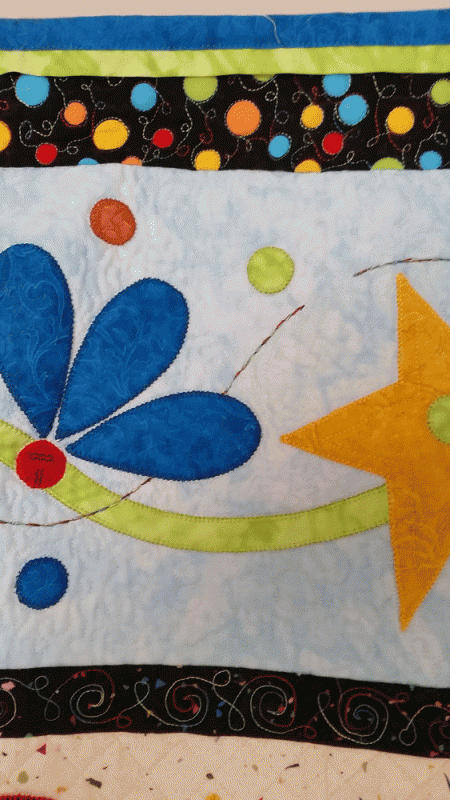 I included the lower-case letters in the quilting for the blue borders; that was really fun. I used Superior Fantastico variegated thread for circles and spirals in border and sashing. The blocks use Superior Mono-poly; the border stippling uses a matching Isacord; the applique and top-stitching of applique use the Superior Magnifico thread kit.