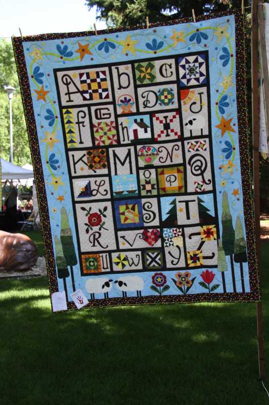 Well TQSers, a lot has happened in the last week. I put A to Z in a little outdoor quilt show, just a fun little show. A woman who lives in that town contacted me and insisted that the quilt just spoke to her to say Buy ME!!! Well, to say I was flabbergasted is an understatement, because I hadn't advertised that she was for sale. So we agreed on a price, but I asked to pay half now and I keep it to enter it in our local county fair and she agreed. We negotiated for a price (Nancy she came up from what I told you) and paid me on Friday. The fair is the end of July so she will receive her quilt after that. So I know many of you are asking for closeups for your quilting and Jerry said he would do that before she goes to her new home. She is hanging wonky because of the slight breeze.