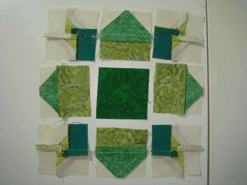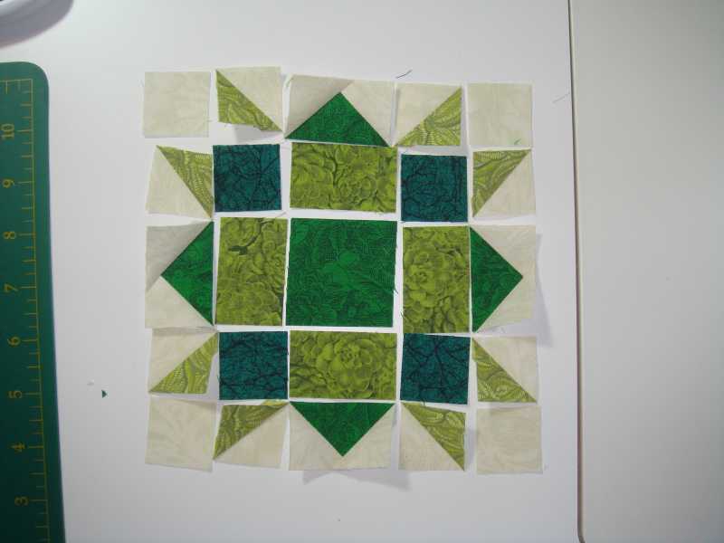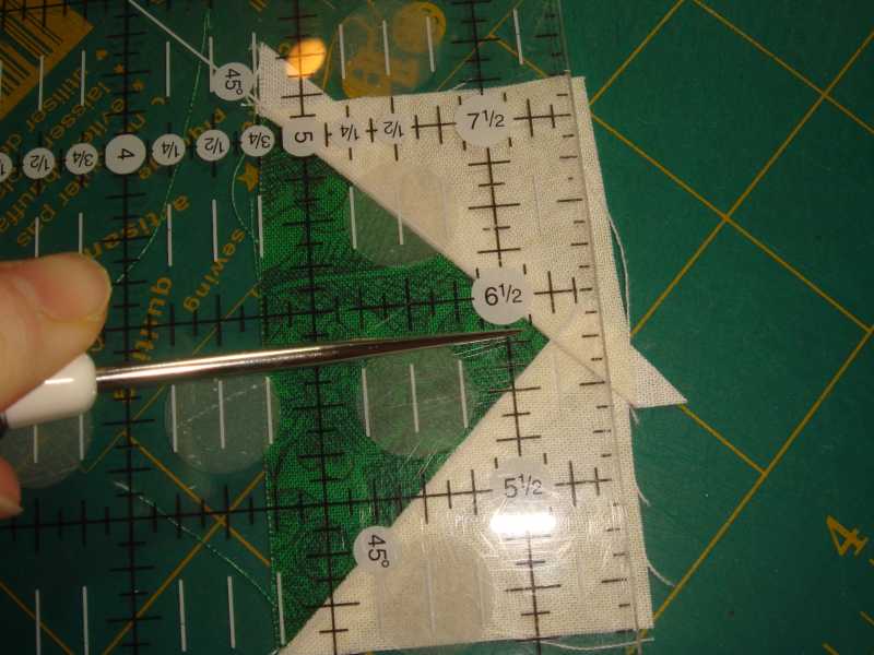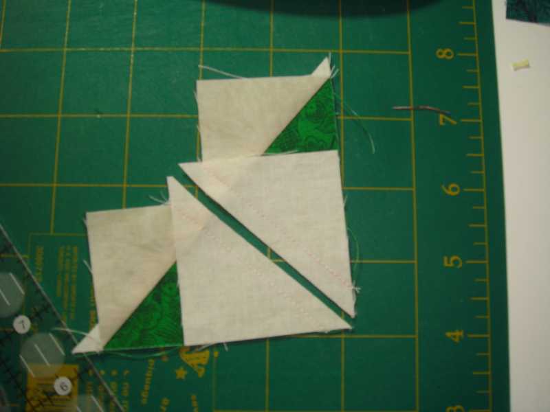 Here is how I did each "flying geese" block. It's oversized, and then cut to correct measurement for accuracy.
