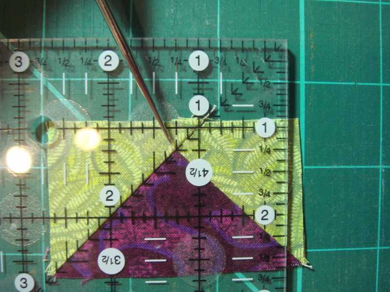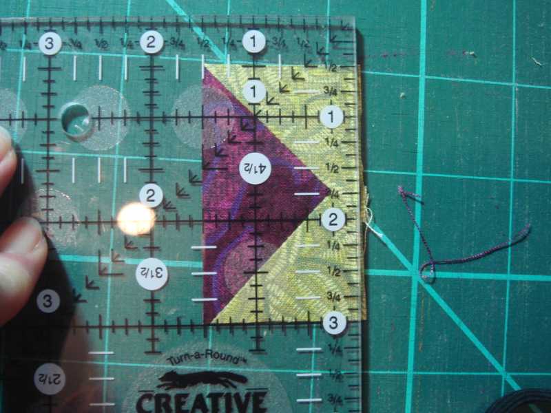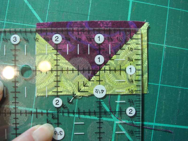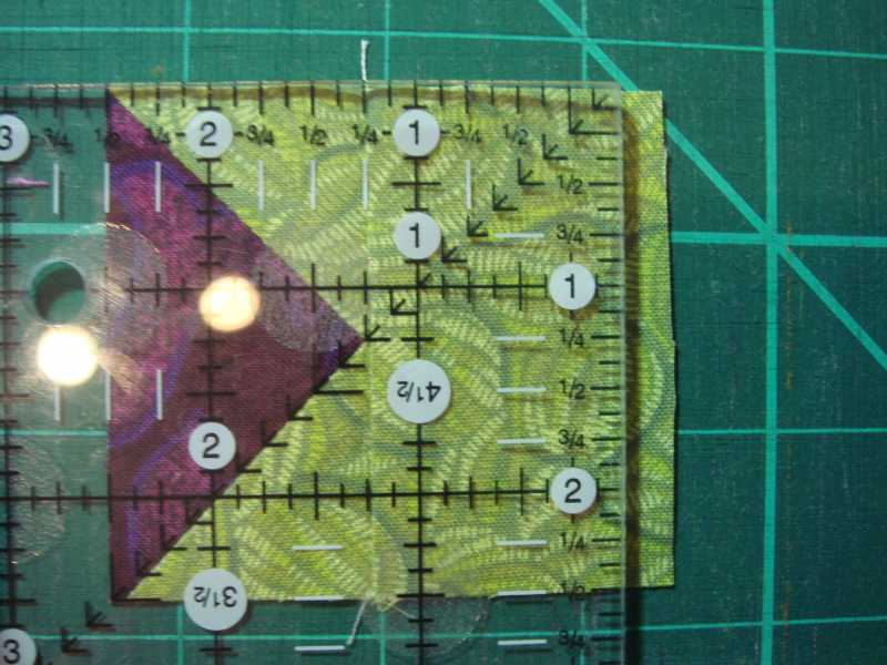 I used a square ruler with a diagonal at the corner. We need to cut the flying geese to 1-1/2" x 2-1/2" from edge to edge.