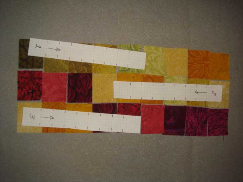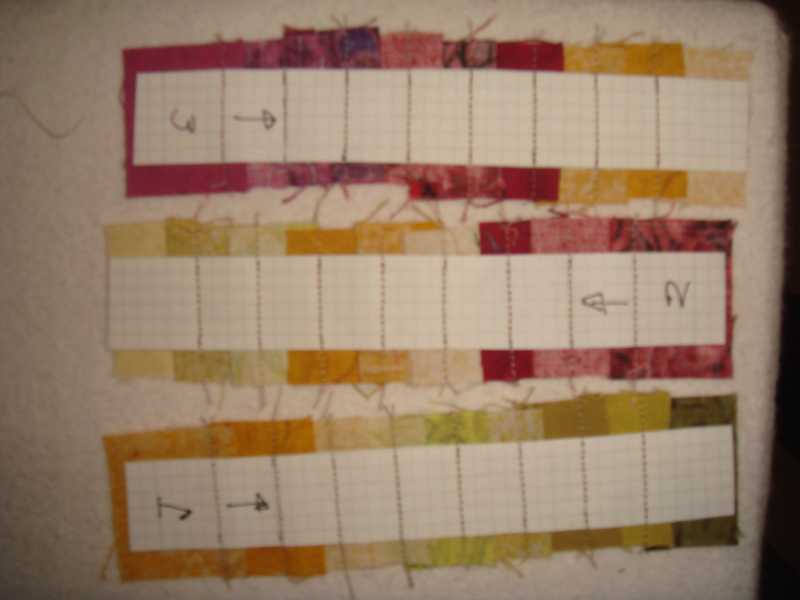 I placed my squares around the center block in a "controlled ramdomness" :woohoo: and placed my paper strips alternating the beginning piece - this will ensure that the seam allowance "nest".