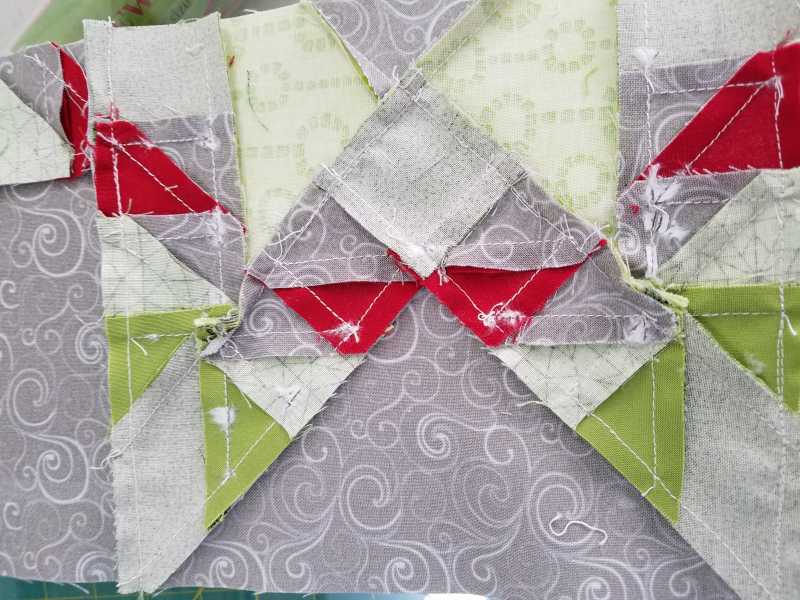 Here is what my back looks like--not perfectly flat on the back but fine on the front. There IS a lot of fabric/seam allowance with these small pieces.Originally posted by "cmd77" post=140098The problem I'm having is when I try pressing where all the greens and red come together there is so much fabric it won't press flat.