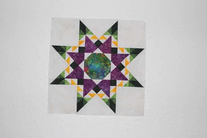 Sharon, I really like the center fabric because it draws you in with its translucent colors that complement the rest of the colors of the star, draws the eye out to the purples and back to the center. The yellows and pale greens as well as what appears to be a purplish color in the center "belong" with all the other colors you have there. I also like how you chose the greens for the tips of the star because of the gradations in color from dark to light going inward. The only question you might ask is, if you use the focus fabric again, as Sue Garman does, in the border of delectable mountain blocks, would that be to your liking? If the answer is "yes," then it will work. If you plan to put another fabric in the delectable mountain border, then you'd have to figure out where else would you put the focus fabric.