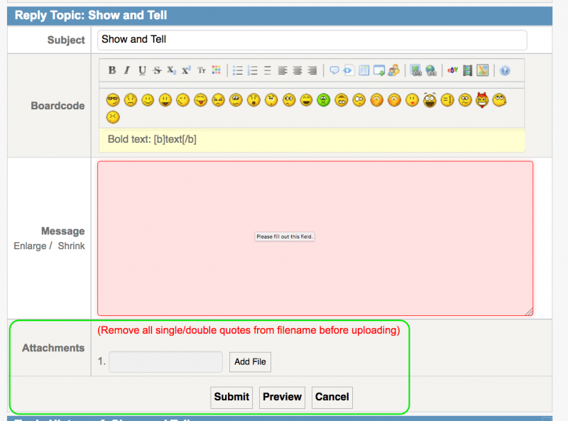 [li]You'll see the name of your photo file between the word attachment (written twice). You won't actually see the photo until submitting your post to the forum.[/li]