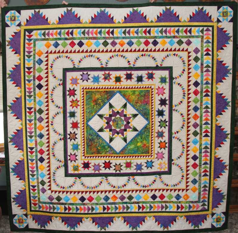 Well, here she is Colorful Colorado Medallion. She was a bugger and after cutting off (yes you heard that right) the entire delectable mountains border, remaking them correctly (no bias on the outside), reattaching the new border she is quilted and flat thanks to blocking. I am now very happy with her and after hoping to show her a little, she will be a wedding gift. We can't keep all of them, can we? hehe