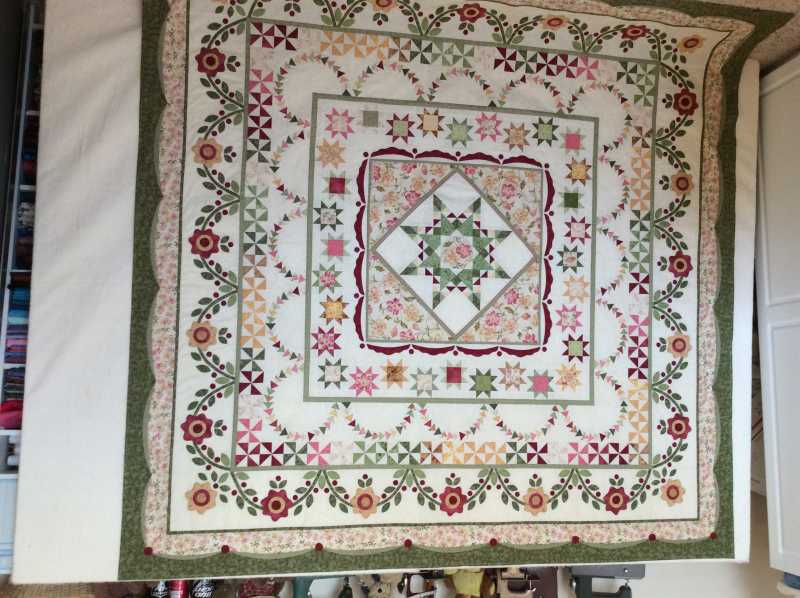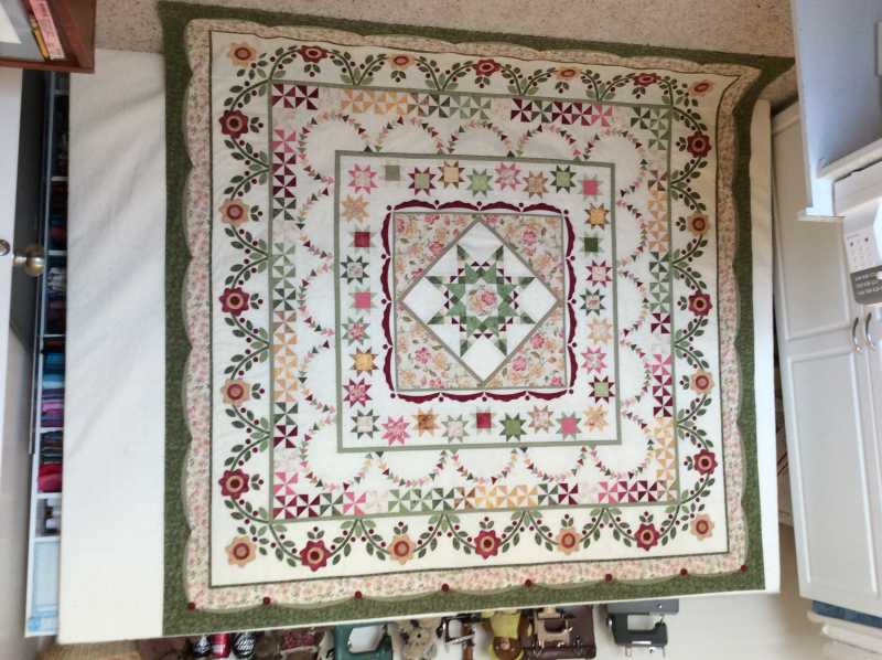 I am finally done with quilt. I had no problems until the flying geese border and delectable mountain border. All the other measurements came out as the pattern said.. The measurement for the flying geese border didn't come out correct so that the delectable mountain border would work. I used finally ended not putting a border between the flying geese and delectable mountain borders.. Still can't figure out what the problem was, but it finally is completed. I used my reproduction fabrics and the measurements came out 83 1/2 x 83 1/2.