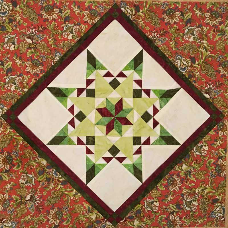 Cathy, I think the difference is whether your medallion on point with the triangles sewn on measures the required size of 24 1/2 inches. Your seam allowance will always be 1/4 inch, but if you need more of the triangle fabric to meet the 24 1/2 inches size, then when you sew your floater strip on, there could be a little more distance from the point.Originally posted by "Cathy2290" post=139713I have a question about the points in the star and the 2nd floater. Should there be a gap between the point and the seam or should it be a flush point like in most points. I thought I had made my triangles too big and then I noticed some pictures seem to have the gap.