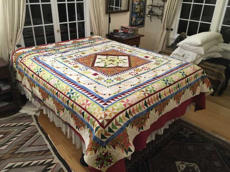 It is finished with 3days to go in2017. It was a journey. I learned so much and especially the use and method of floaters that I know I will use over and over again. It came with some challenges. I redid the curved flying geese so got a bit of practice doing those. I ran out of focus and background fabric and supplemented. It was challenging but fun.