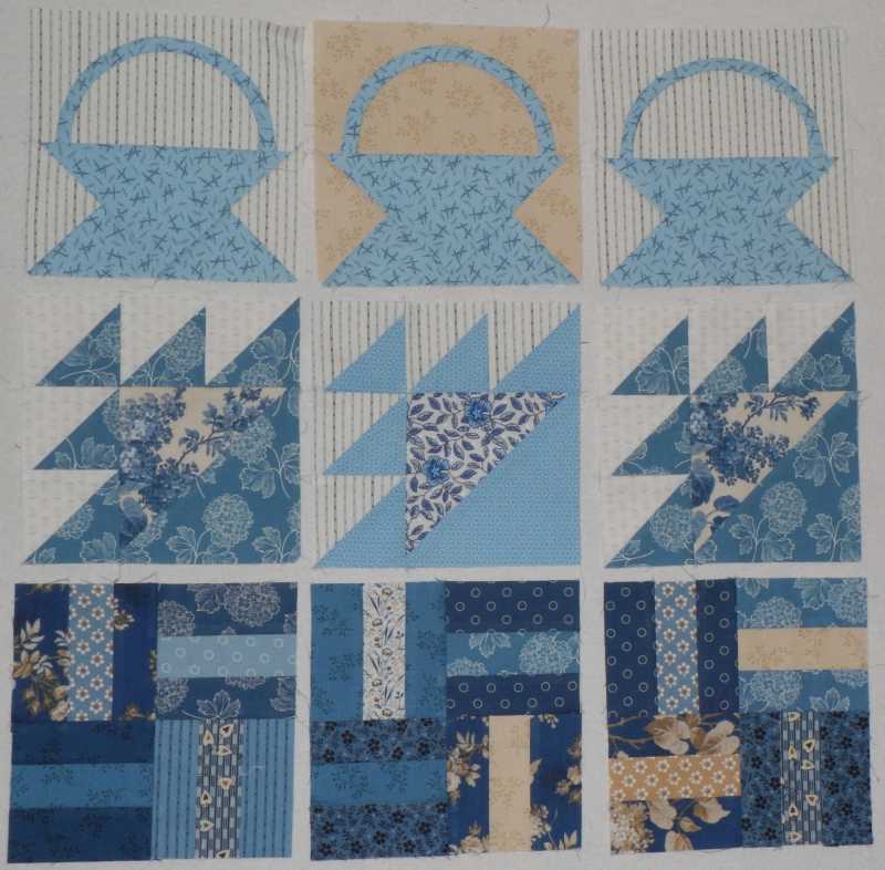 This was a bit of a challenge. I ended up replacing the background directional fabric in block 19 so I could use either direction in those half triangles. I used Marti Michell templates to cut the quarter square triangles in block 21. After doing two of them in the striped background, I went to an allover print for the third basket. Block 20 used odds and ends of fabrics, don't think any of them are like the picture. They were used as leader/enders on the other blocks, when needed. I ended up making extra rails, just because I wasn't counting, so could play around with them at the end.