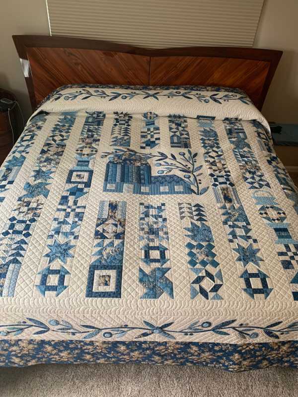 Your quilt is beautiful. I started this BOM for my sister she always loved blue and white, each month when I made the block I would send her pictures. At that time she was having treatment for cancer. She lost that battle on Labour Day weekend and I could not continue working on it. Recently I have gone back to it I will finish it. Each month I made 4 blocks planning on making it bigger I am so grateful to you for posting photos, this will help me move forward. Thank you Joan Davidson