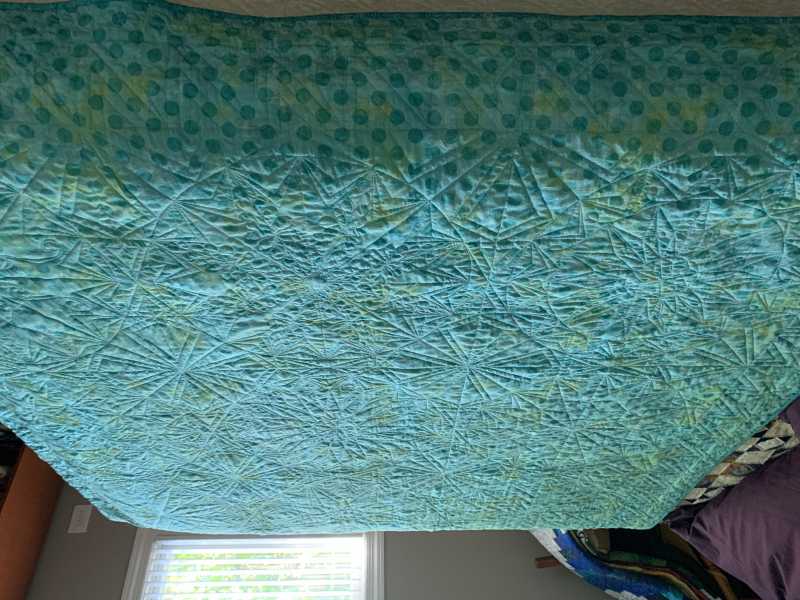 The color gives a nice calm, cool feeling to the quilt. The density of stitching is even throughout which also gives a calming effect to look on the back side.