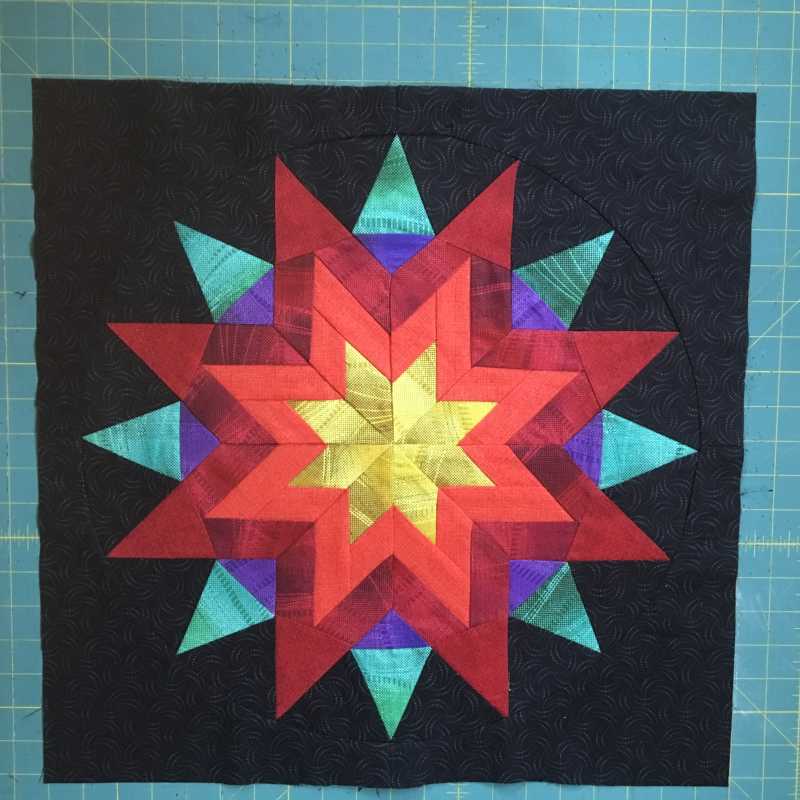 and can still make the changes when I make the full size one. I have learned that blocks like the second one can have a lot of bulk by all the seam allowances that meet in the center. My solution is to appliqué a circle over the seams, and then cut them away from the back. It looks like part of the design and solves the big bump in the middle.