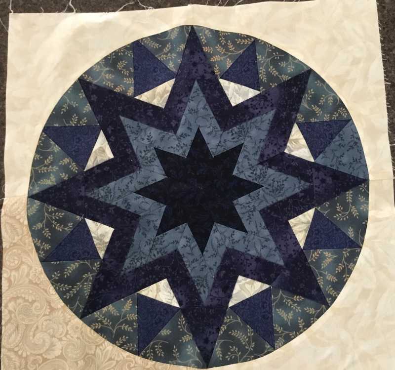 Here are my month 1 and month 2. I have this stained glass window in my kitchen and have been wanting a wall hanging in my family room to compliment it. Have made the blocks 75% of size in order to accommodate the size of wall I have to put the finished piece on. I want to wait to determine placement before sewing the corners on. Very much enjoying the challenge of this BOM!