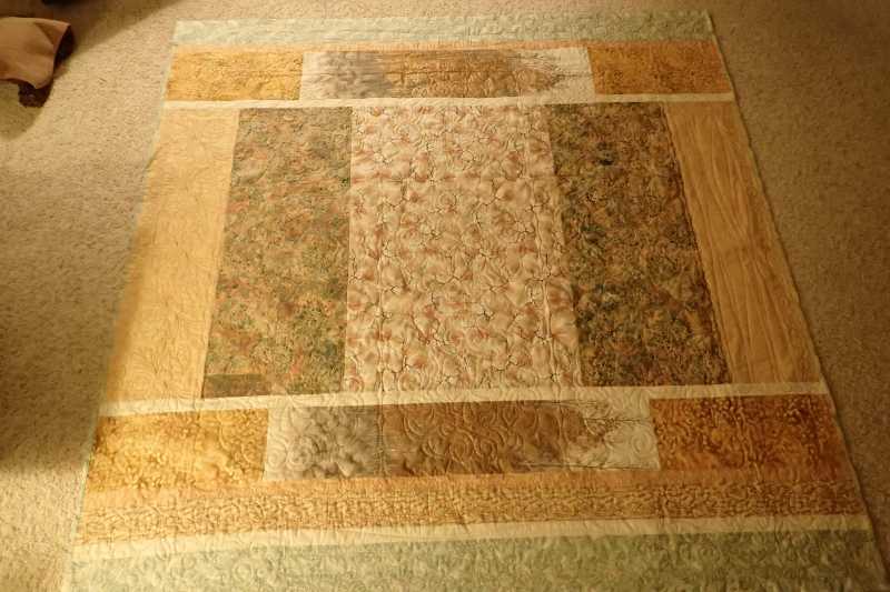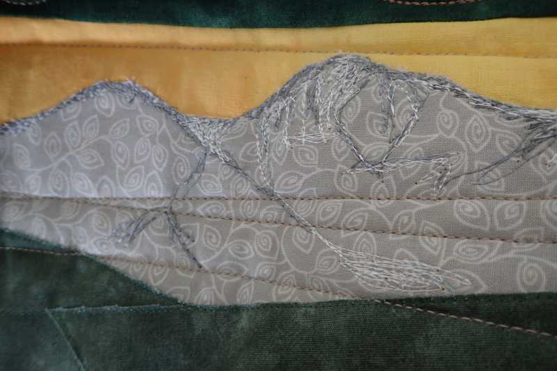 In August I went to a taping of TQS in Denver. I hadn't considered doing the BOM before that. I saw the quilt up close and the TQS folks encouraged me: "You'll learn so much!" There were a couple of colors in the kit that didn't appeal to me so I went home and looked at my stash. I thought I'd do one square and see how it went. - The first one went well, and then I did the next and the next...I liked using my own fabrics. The earthtone colors are really my favored palette. I don't mind applique, but I knew I'd be unhappy doing so much of it on the border. My plan at first was to put pine cones along the bottom, trees along the sides and then mountains on top. I was in The Fig Leaf quilt shop in Fort Collins and the Robert Kaufmann panel fabric caught my eye as perfect for the side panels. I purchased the pine cone paper piece pattern online and did not like the pine needle part of the pattern. so I just made the pine cones and pieced them together in pairs. Once I had the sets of two, it just seemed to work best to put them in the corners. I was going to piece the mountains, but I ended up simply doing raw edge applique with a little thread painting to embellish. The needles on the pine cones are couched green cord. To prepare the pine cones for couching, I used a tear-away stabilizer on the back. I tried using a LePen marker to make the needles but I did not like the results so I went with the couching until I got tired! I almost didn't piece the back, but the leftovers spoke to me.