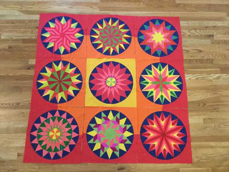 I just finished block nine and have decided to make a pieced border like the one you did. I want to thank you, Barbara for all your tips and help. I also want to thank Becky Goldsmith for all the time and effort she put into designing this quilt and all the excellent videos and tips she shared. This is the first BOM I have finished and I love it! I chose the warm colorway (red is one of my favorite colors). I am playing in EQ7 and the fabrics I have left to layout my pieced border.