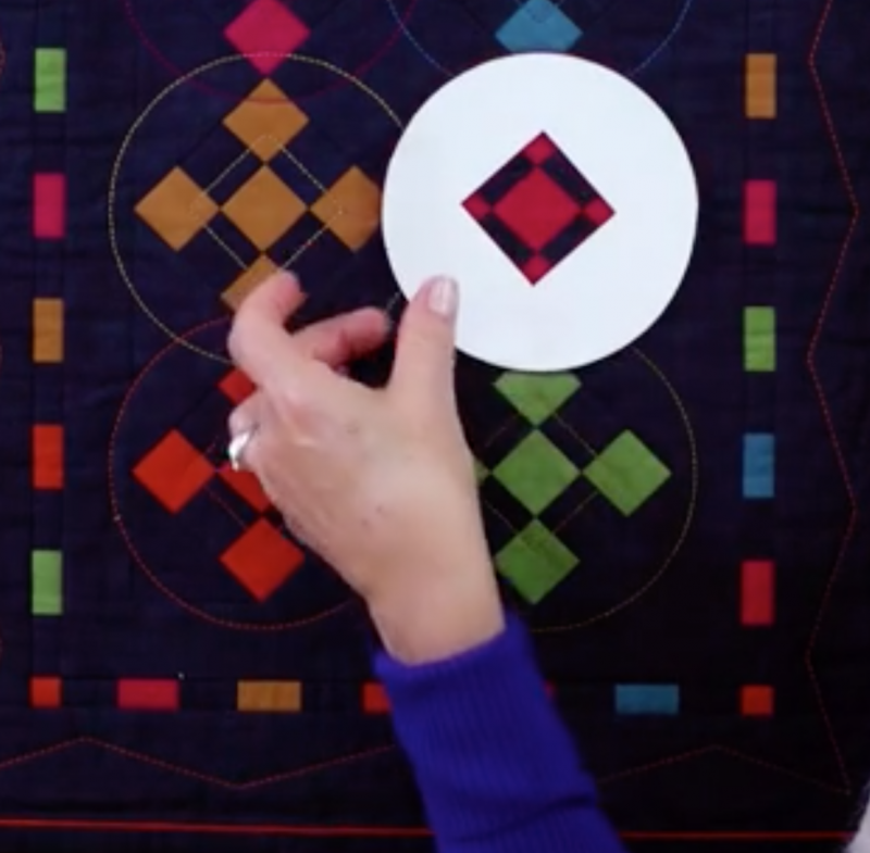 where she uses different shapes made out of freezer paper; irons them to her sandwiched quilt and stitches around the