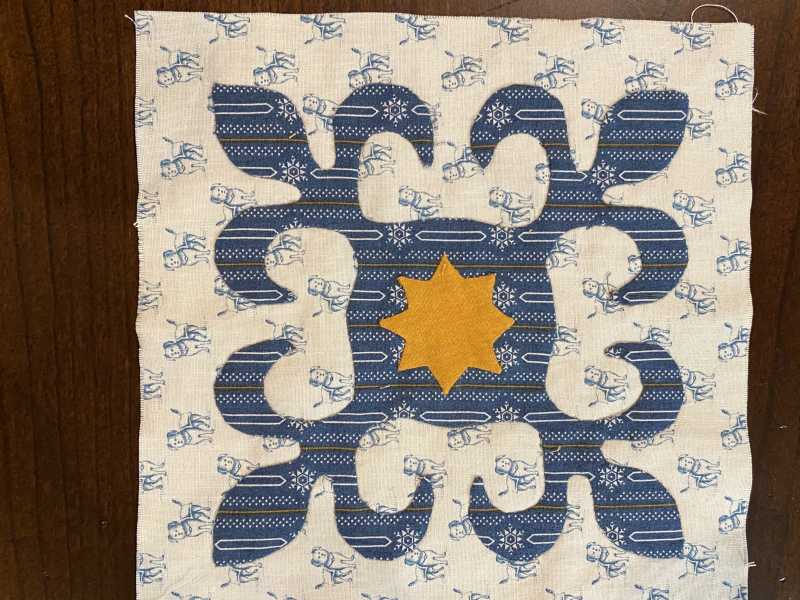 I had never heard of or seen back basting appliqué until I read comments on this forum. Since I like learning new things, I decided to give it a try on Block 5. The outside edge turned out okay, but the center of the block looked awful. I appliquéd a new center over the mess and still may redo this block at some point.
