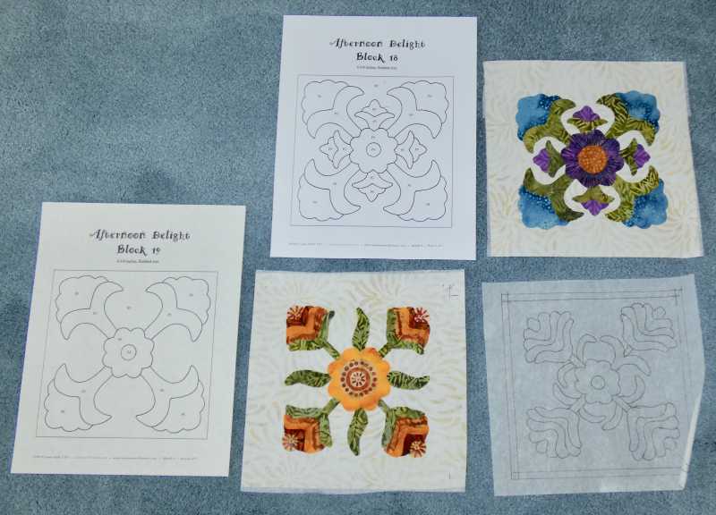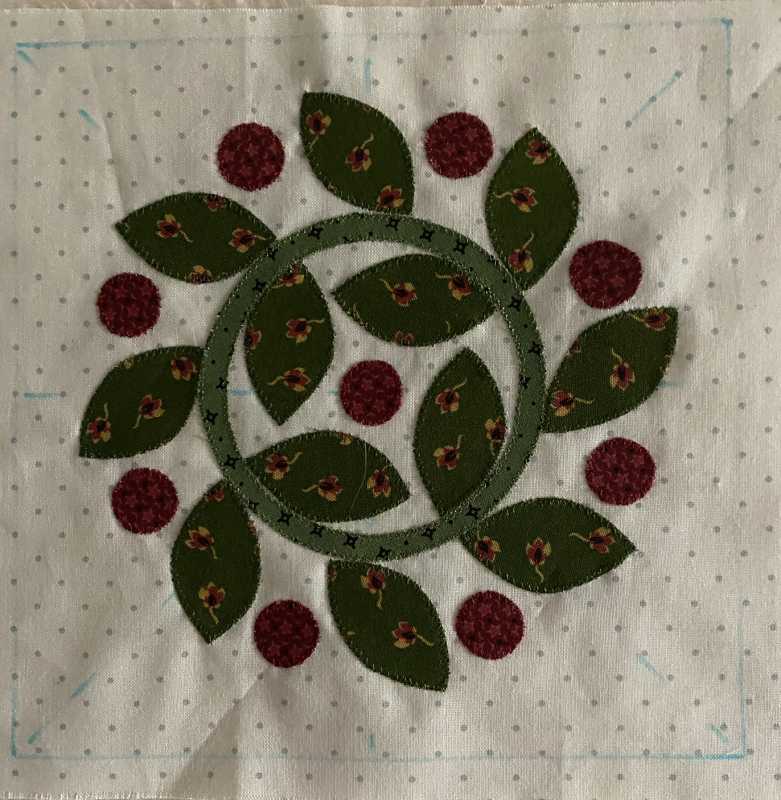 Whew! I finally finished my April blocks and one extra Shoo Fly -- only one day late. I had trouble with Block 15, mostly because it sat for a long time after I marked it for needle turn and started stitching. The chalk pencil was just really hard to see. I'm also not thrilled with the "berries" on my wreath block. I can always redo them later if I want to do so. For now, I'm moving on to May.